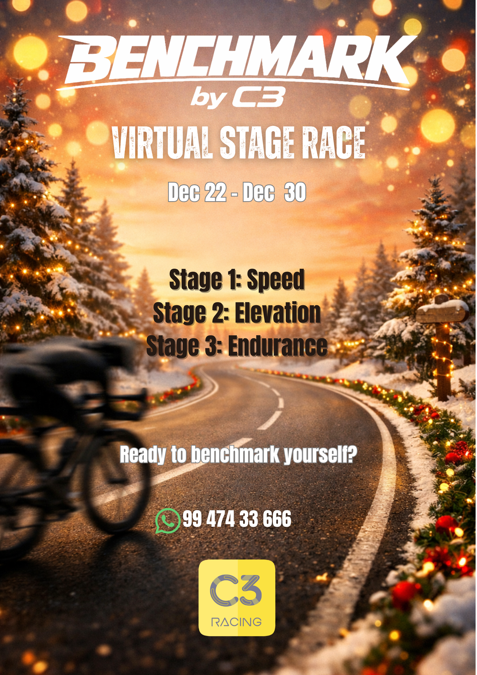 Race the festive season with a virtual stage race format, testing sprint speed, sustained power, and endurance across three stages.