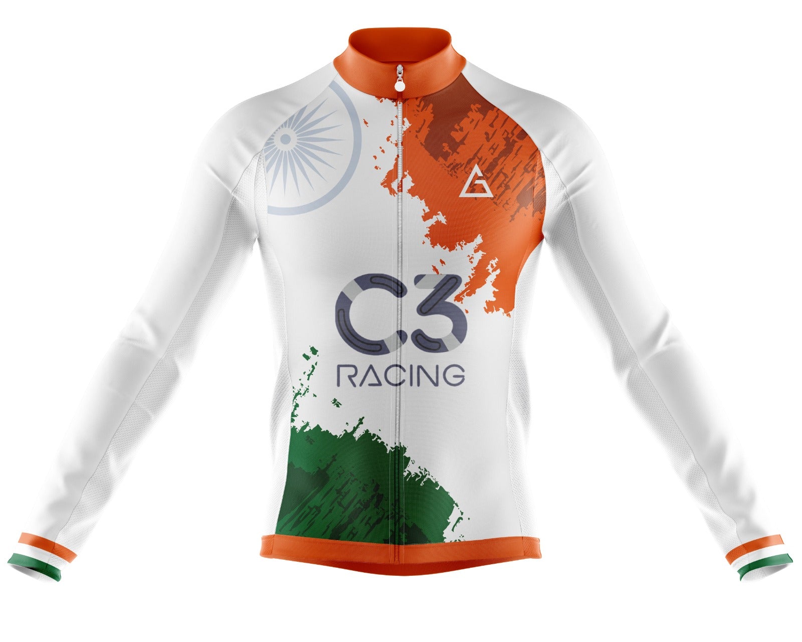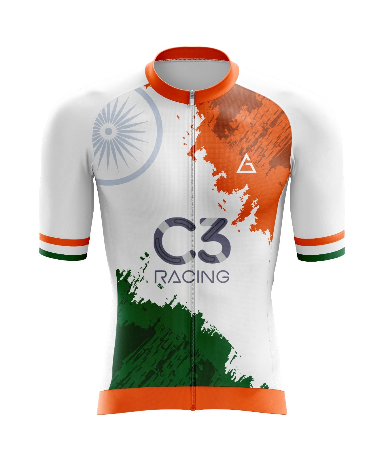 Ride with pride in our C3 Tricolor Cycling Jersey by Aidan Global, inspired by the Indian flag. Designed for performance and comfort, this jersey is perfect for training rides, races, or weekend group rides.