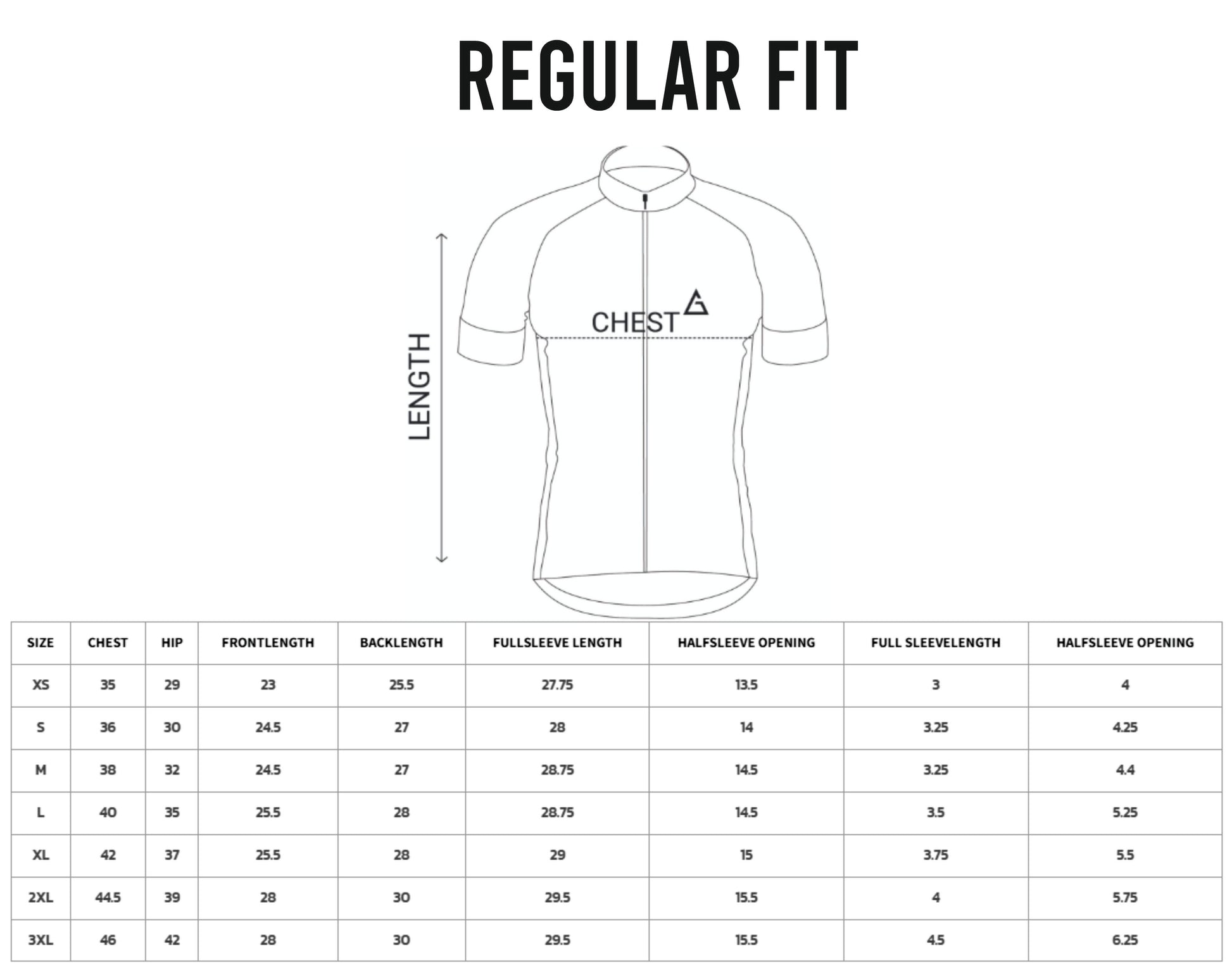 Size charts for Race fit and Regular fit included in the product image section. Kindly check size chart before choosing your jersey size.