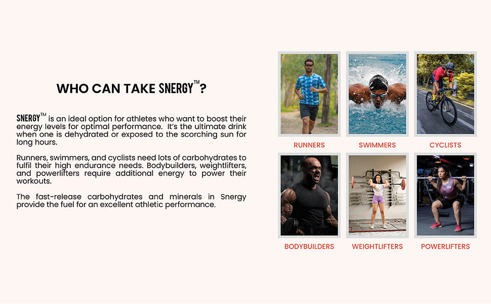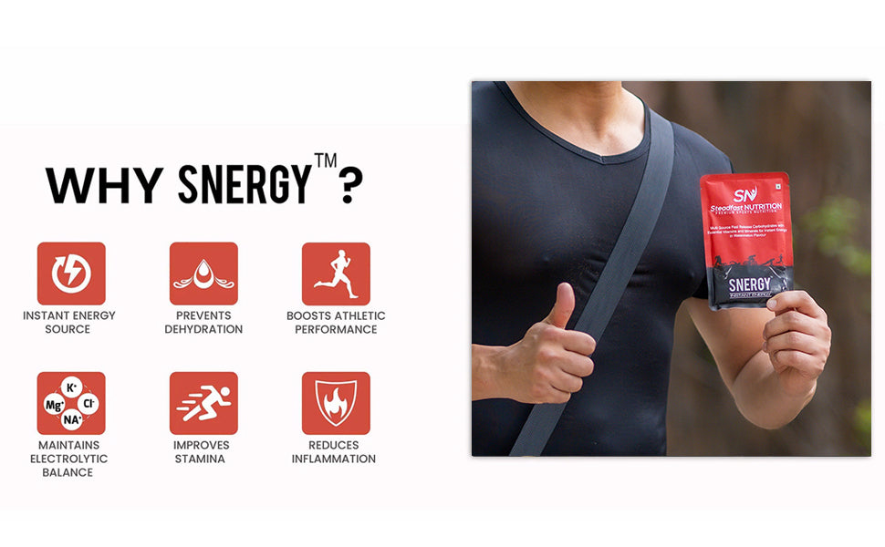 - Healthy Energy Source - Snergy is a supplement for instant energy and hydration. It contains the simple carbohydrates dextrose and sucrose and essential vitamins and minerals, which give an instant energy boost and replenish lost energy and electrolyte stores. Each 45 g Snergy sachet provides 163.8 Kcal energy. The drink comes in refreshing and delicious orange and watermelon flavours.